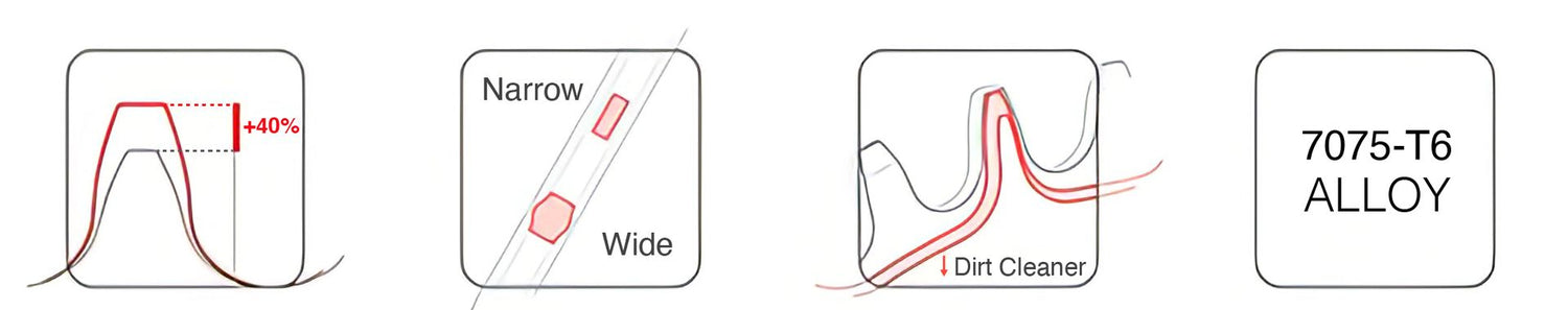 Mudgap och fasade kanter: Designen förhindrar att lera och skräp samlas, vilket säkerställer smidigare växlingar och minskar risken för kedjeavhopp.